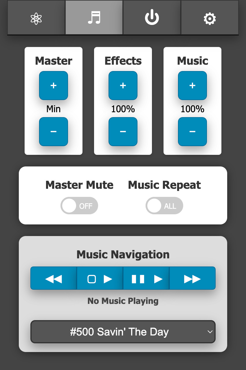 This section allows full control of the system (overall) volume, effects volume, and music volume along with the ability to mute/unmute all devices. The current volume levels will be shown and updated in real-time whether adjusted via the web UI, the pack, or the wand.