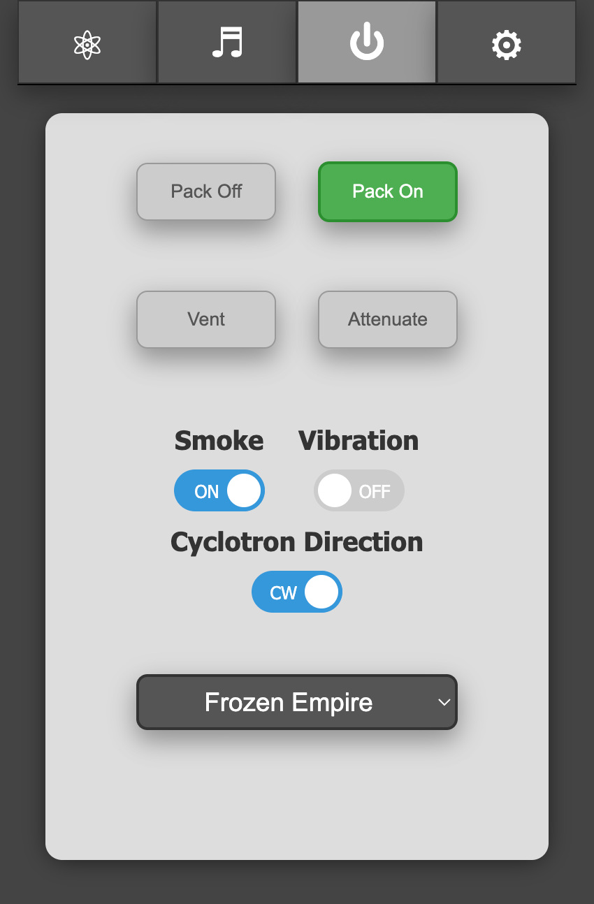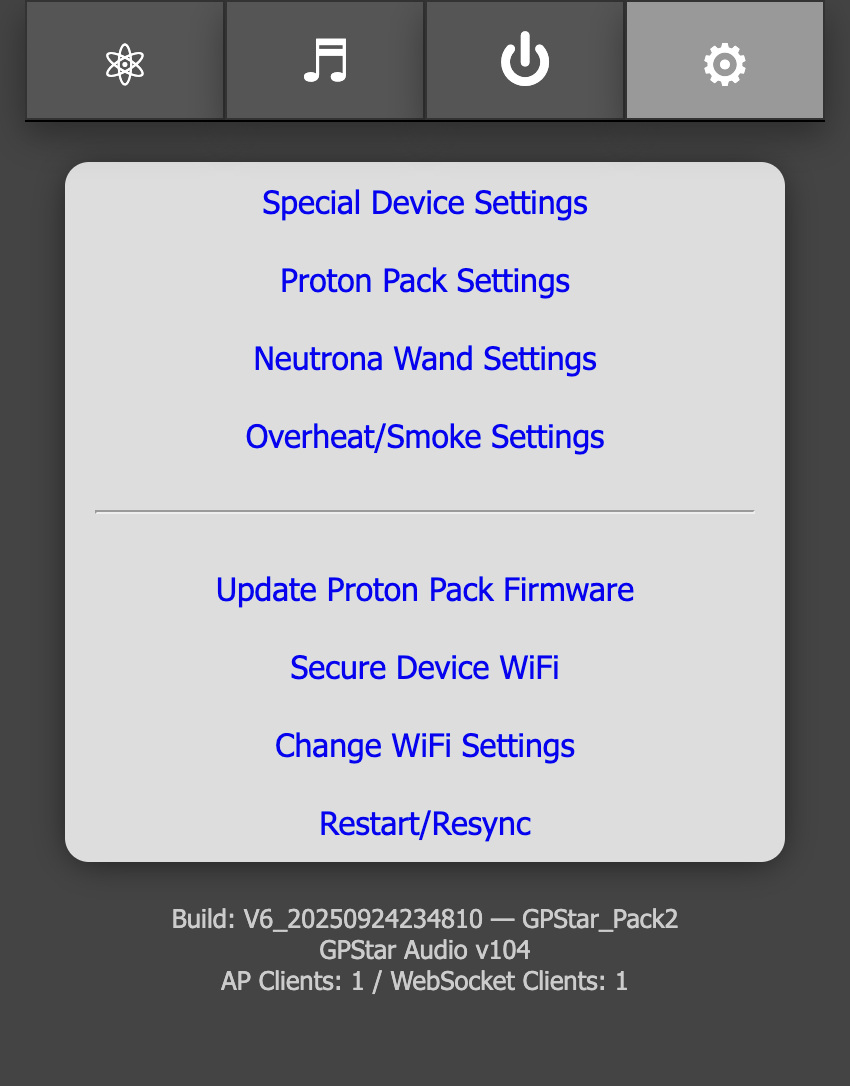 A web-based user interface is available at http://gpstar_pack2.local or http://192.168.1.4 to view the state of your Proton Pack and Neutrona Wand, and to manage specific actions. The available sections are described below.