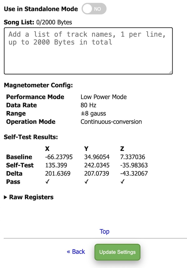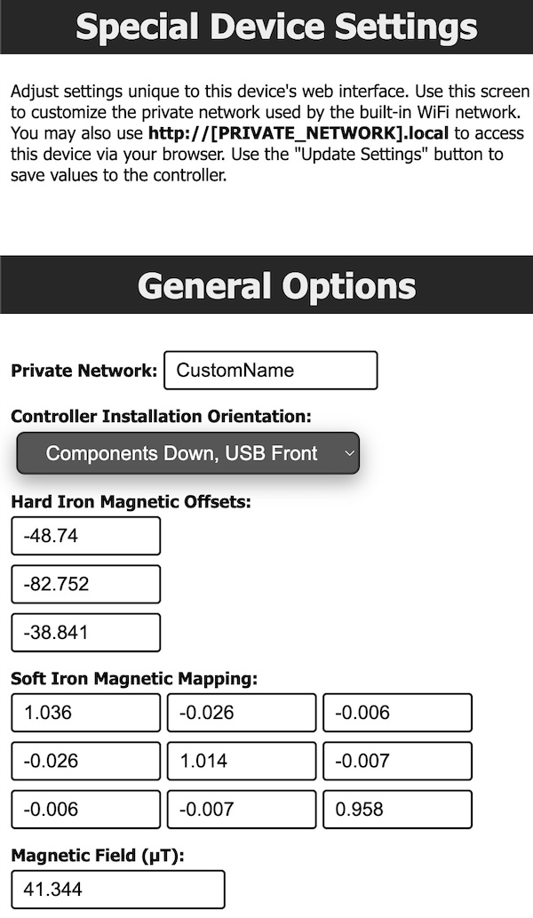 The magnetic offset information it editable but not recommended to do so unless you understand the purpose. The display of "Hard Iron" (magnetic corrections) and "Soft Iron" (nearby metallic interference) can be used to verify that calibration of the device produced unique values to your Neutrona Wand device. These will be applied automatically to sensor readings to ensure consistent and stable behavior.