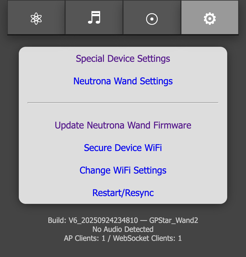 Set options related specifically to the Neutrona Wand. These can be accessed from the GPStar Proton Pack II, or by connecting to the GPStar Neutrona Wand II directly over WiFi.
