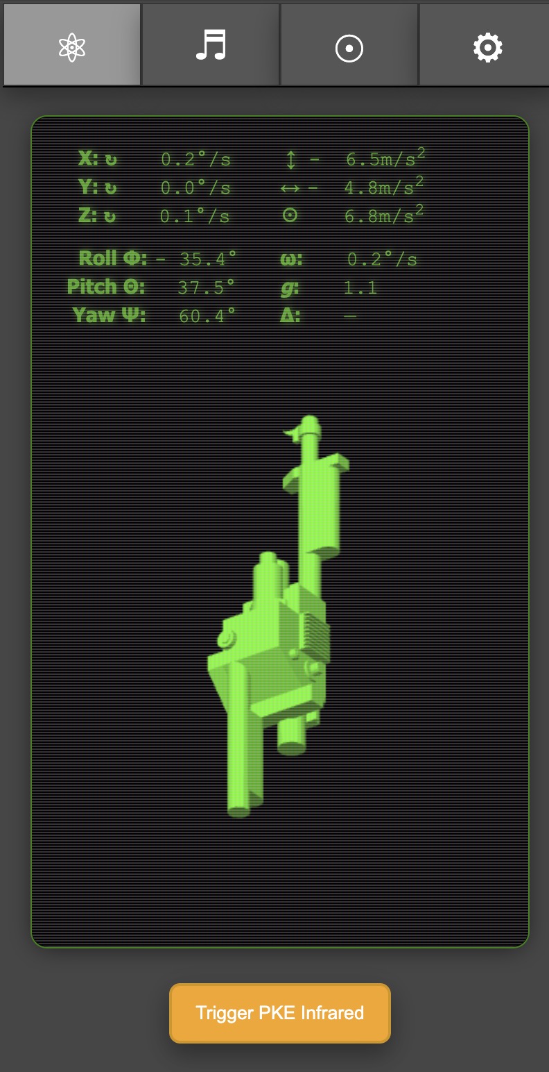 The Neutrona Wand status screen will display the real time rotational coordinates and other sensor data in real time. Moving your Neutrona Wand up, down, and or rotating will automatically update visually on screen. Two buttons at the bottom of the screen allow you to re-centre the 3D representation of your Neutrona Wand and also to trigger a Infrared Signal if you have a GPStar Infrared sensor attached to your Neutrona Wand.