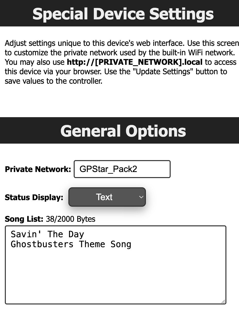 These provide a web interface for managing options which are accessed via the LED or Config EEPROM menus. The settings are divided into 4 sections: Special Device Settings, Proton Pack, Neutrona Wand, and Overheat/Smoke. The features available via these sections will be covered in-depth later in this document.