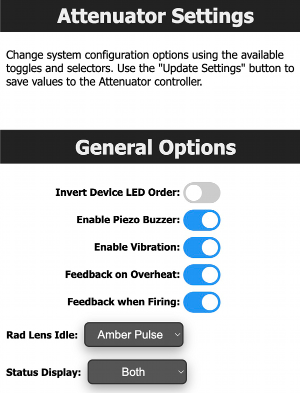 Reminder: The ability to update settings or save to EEPROM will be disabled so long as the pack and wand are running. Turn off all physical toggles to set these devices to an idle state before adjusting settings. Refresh the page to get the latest values for preferences.