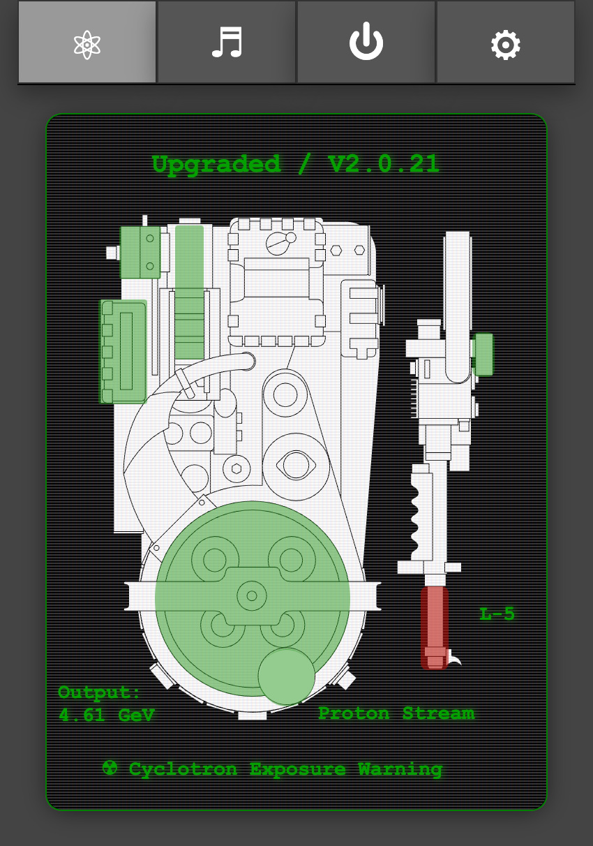 Special thanks and credit to fellow cosplayer Alexander Hibbs (@BeaulieuDesigns87) from the South Carolina Ghostbusters, who created the amazingly detailed Proton Pack and Neutrona Wand technical illustration, available as a printed poster or digital image. He has graciously provided a version of his design to make the new graphical interface.