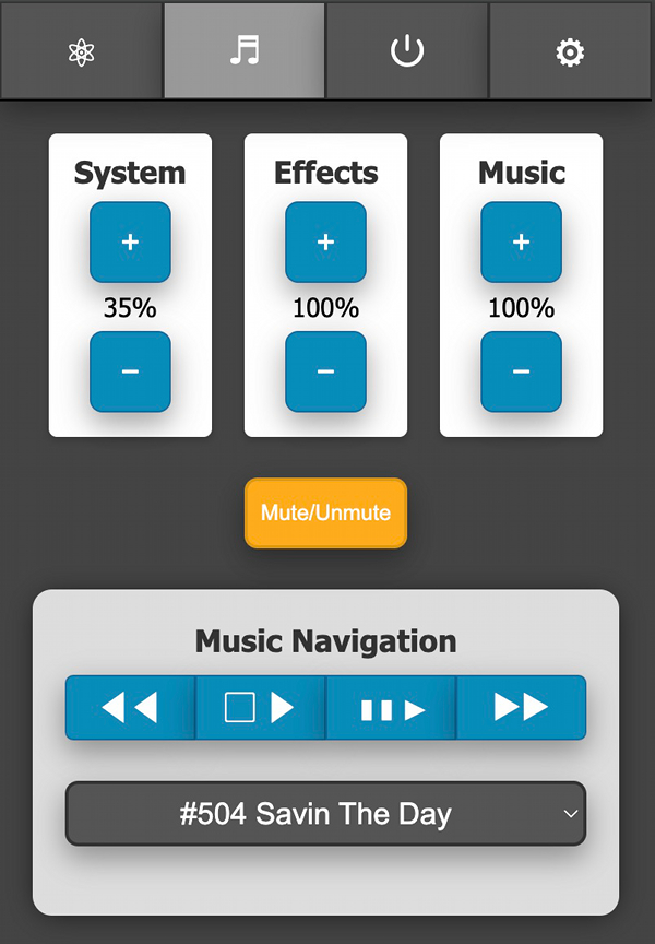 This section allows full control of the system (overall) volume, effects volume, and music volume along with the ability to mute/unmute all devices. The current volume levels will be shown and updated in real-time whether adjusted via the web UI, the pack, or the wand.