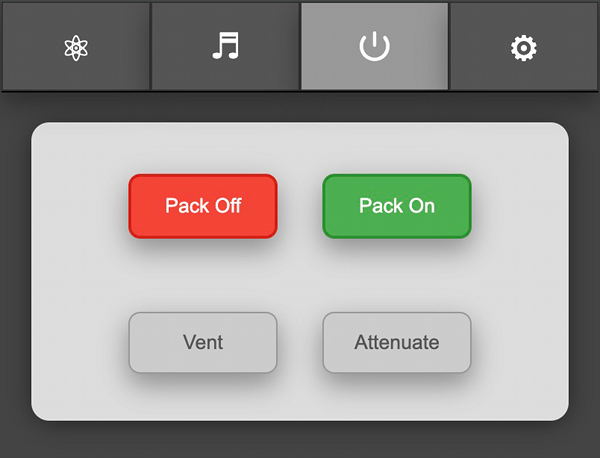Shown here, the pack and wand are both in an Idle state while in the "Super Hero" operation mode which allows the pack to be turned on/off remotely. The options to remotely vent or to "Attenuate" are only enabled when the devices are in a specific state.
