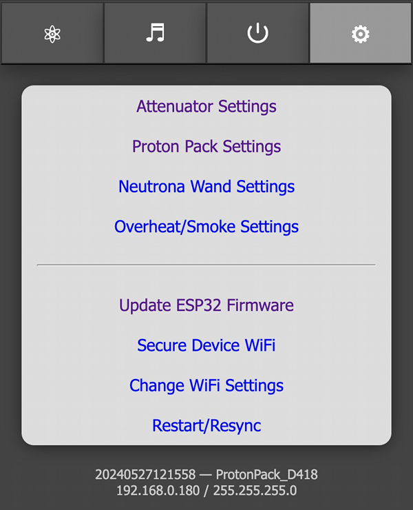 A web-based user interface is available at http://192.168.1.2 to view the state of your Proton Pack and Neutrona Wand, and to manage specific actions. The available sections are described below.