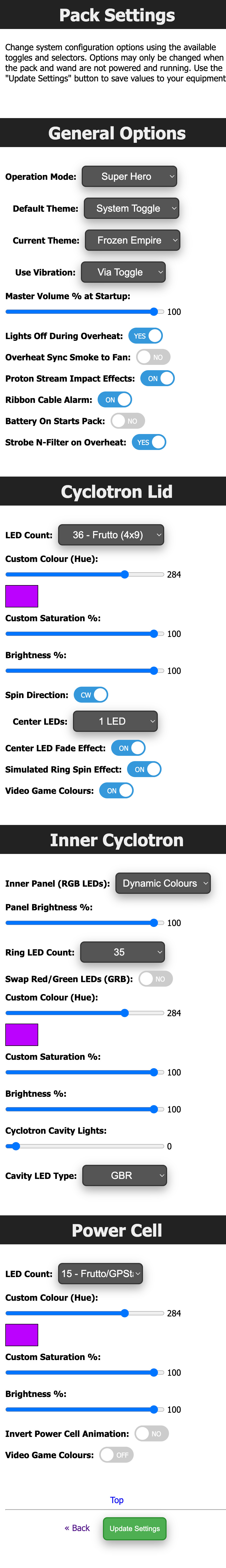 Set options related specifically to the Proton Pack. Options such as the color/saturation sliders will only take effect if you have installed upgrades to the RGB Power Cell and Cyclotron lid light kits. Similarly, the Video Game mode option will have no effect on the stock Haslab LEDs.