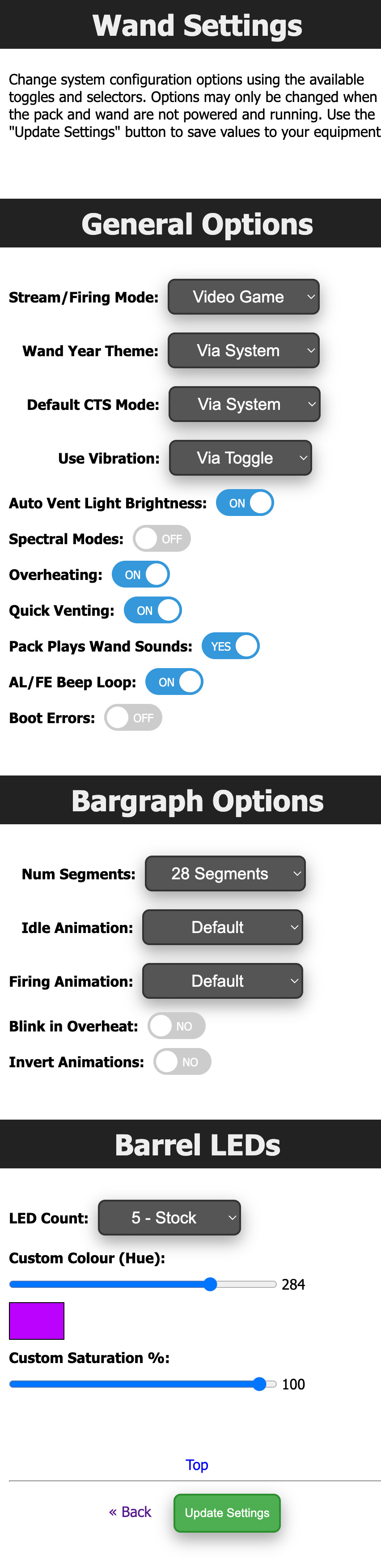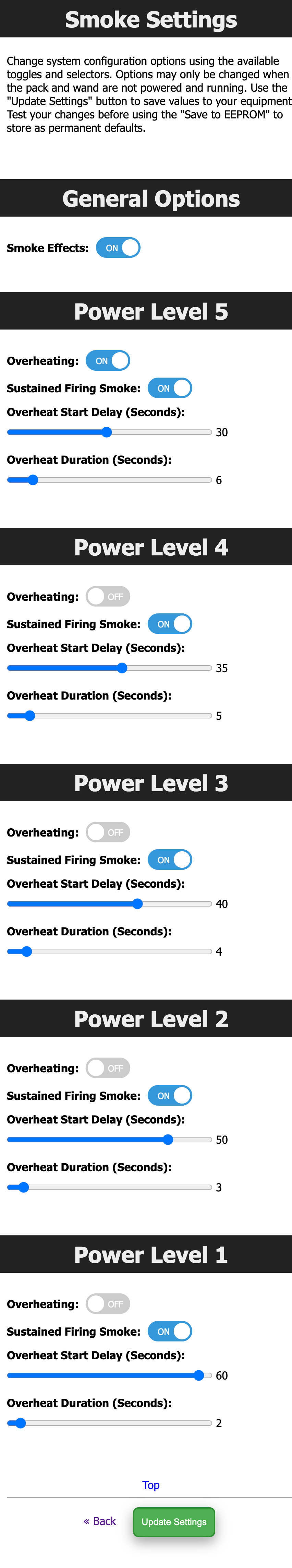 These provide a web interface for managing options which are accessed via the LED or Config EEPROM menus. The settings are divided into 3 sections: Pack, Wand, and Smoke. The features available via these sections will be covered in-depth later in this document.