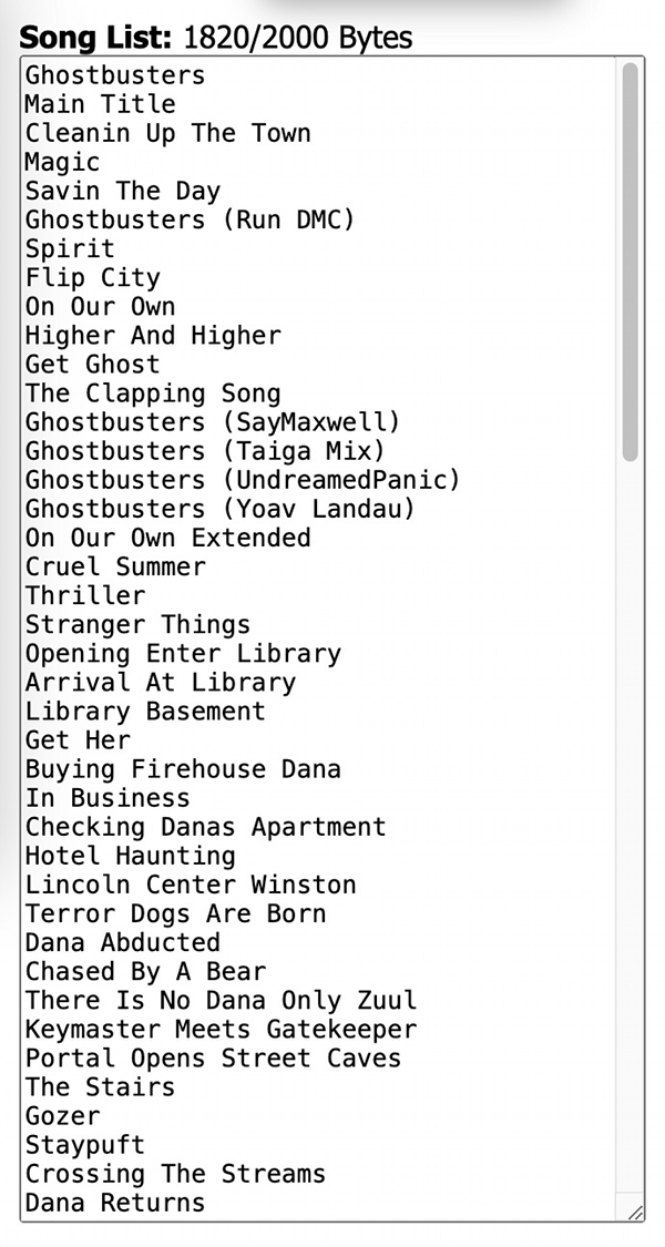 NEW in 5.x - The ability to add a user-friendly track listing has been integrated into the UI. Song titles may be entered as 1 entry per line, in the order by which they are numbered on your microSD card. The text is limited by bytes (max 2,000) not the number of lines, so to fit more entries into this text box you may need to use shorter song titles. This list of songs will be matched to each track number (starting from "500_" per the required numbering scheme). This data is stored only within the device and is only visible/used by the track selection field in the Music Navigation area.