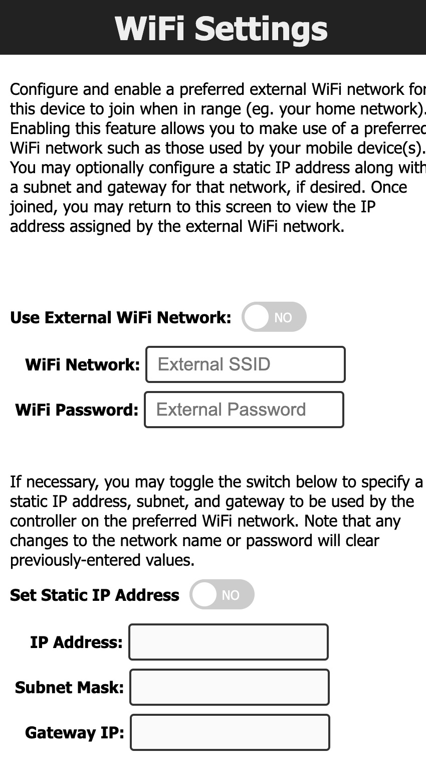 - Change WiFi Settings - Provides an optional means of joining an existing, external WiFi network for access of your device